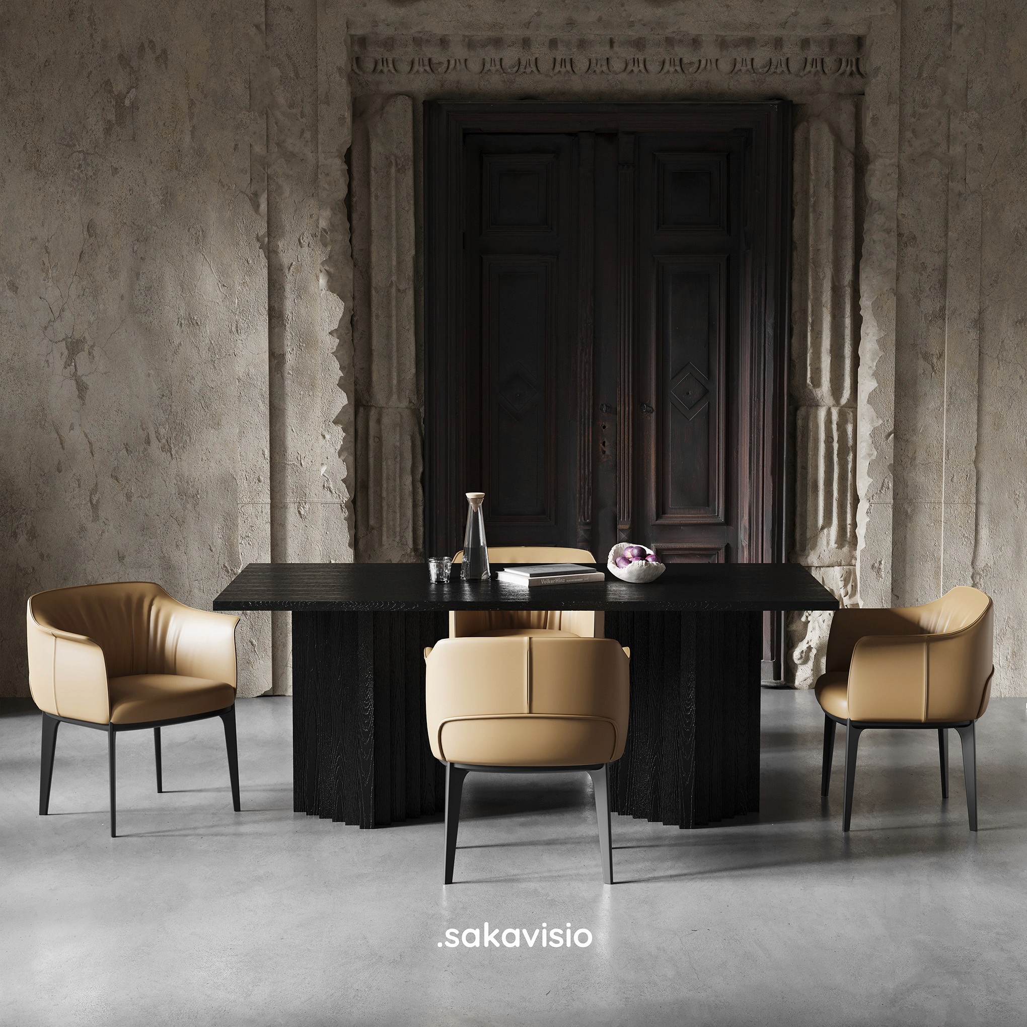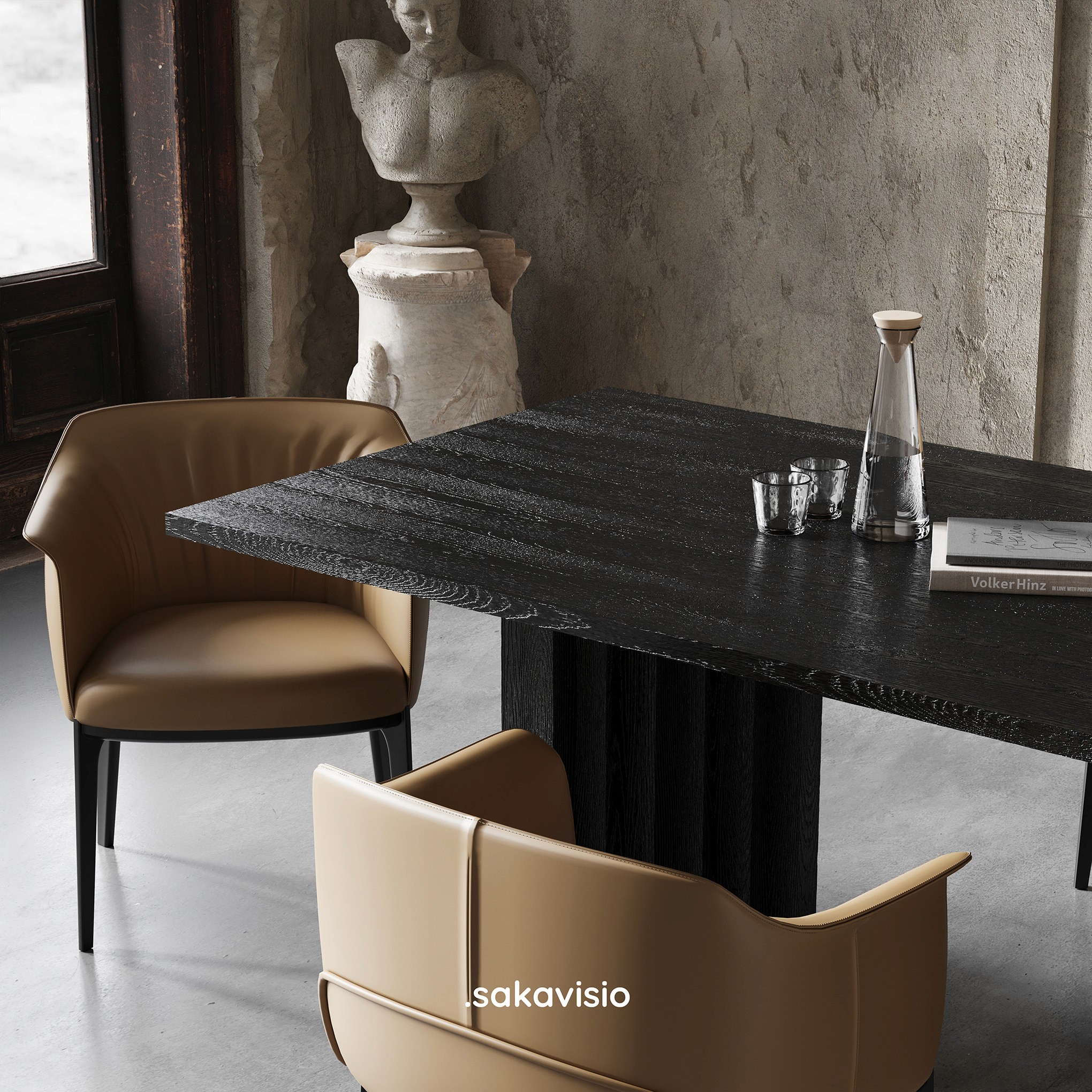 In this project created for Lebein Haus, I blended raw industrial textures with the elegance of modern design. The sculptural table, with its deep black and rough wooden texture, is accompanied by 'Voir' chairs featuring warm tan leather surfaces and elegant pleated details. The weathered concrete walls and antique bust in the background create a striking contrast with the modern forms of the furniture. This composition displays a timeless luxury and a sophisticated stance within the dramatic atmosphere of the space.